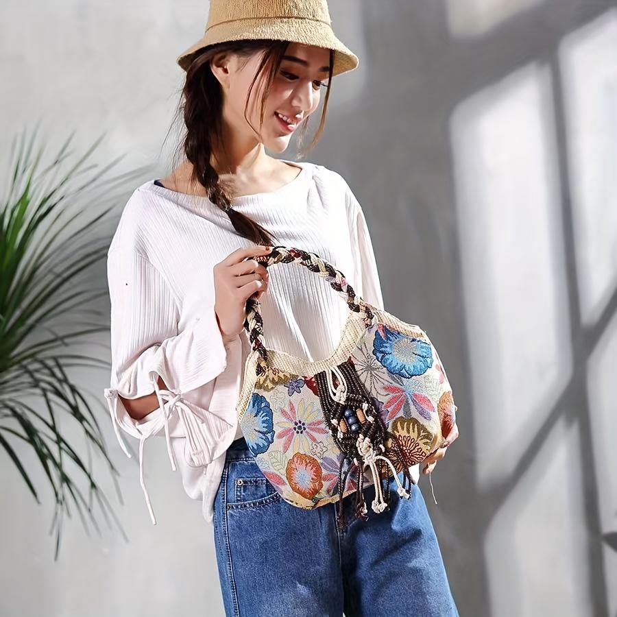 Богемный стиль ручной работы с плетеным узором, плотная сумка-тоут, легкая повседневная женская сумка на молнии с цветочной вышивкой и кисточками