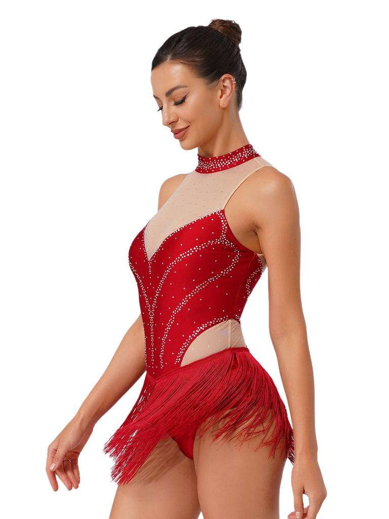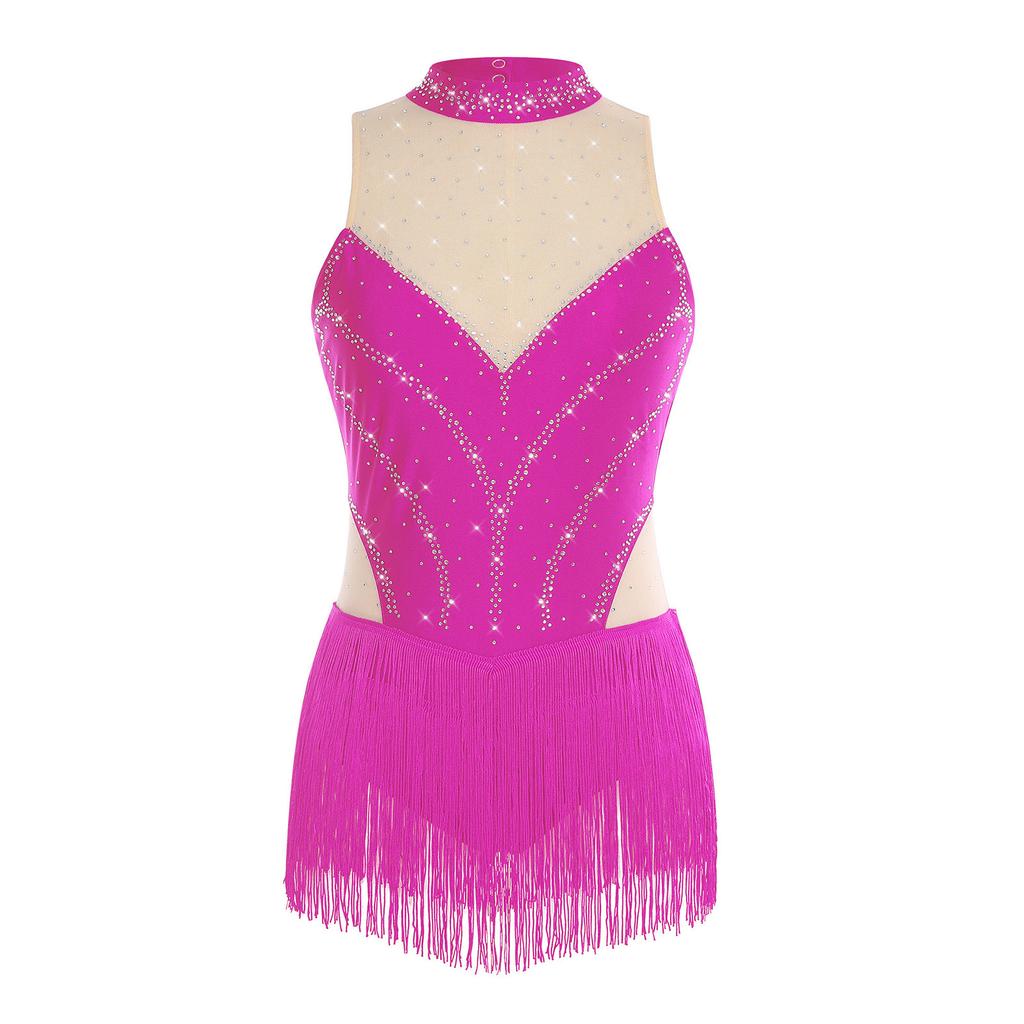 Женский латинский купальник для фигурного катания без рукавов с вырезом-капелькой на спине, бахромой с кисточками на талии и блестящим боди