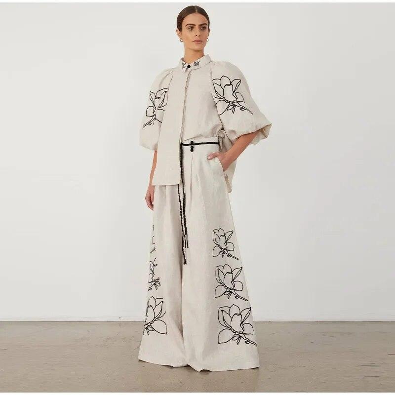 Женский весенне-летний модный комплект из хлопковых и конопляных брюк с принтом, винтажная рубашка с откидными рукавами и откидным воротником, плиссированные широкие брюки, комплект — купить товар онлайн с бесплатной доставкой по всему миру!