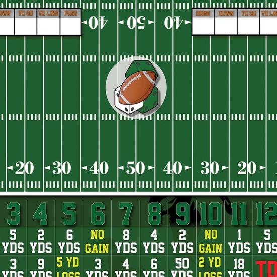 Динамичный игровой процесс с футбольными костями: Используя три специальных кубика, игроки бросают, чтобы определить прибавку в ярдах, и стратегически продвигают свой футбольный маркер.. Эта механика сочетает в себе элемент случайности с тактическим принятием решений, обеспечивая захватывающий настольный спортивный опыт, который имитирует реальные футбольные действия.