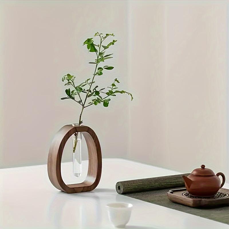 1 шт. Элегантная комбинация вазы из грецкого ореха и стекла - Современный минималистичный дизайн, Деревянная основа с прозрачной стеклянной трубкой, Идеально подходит для декора дома, отеля и квартиры