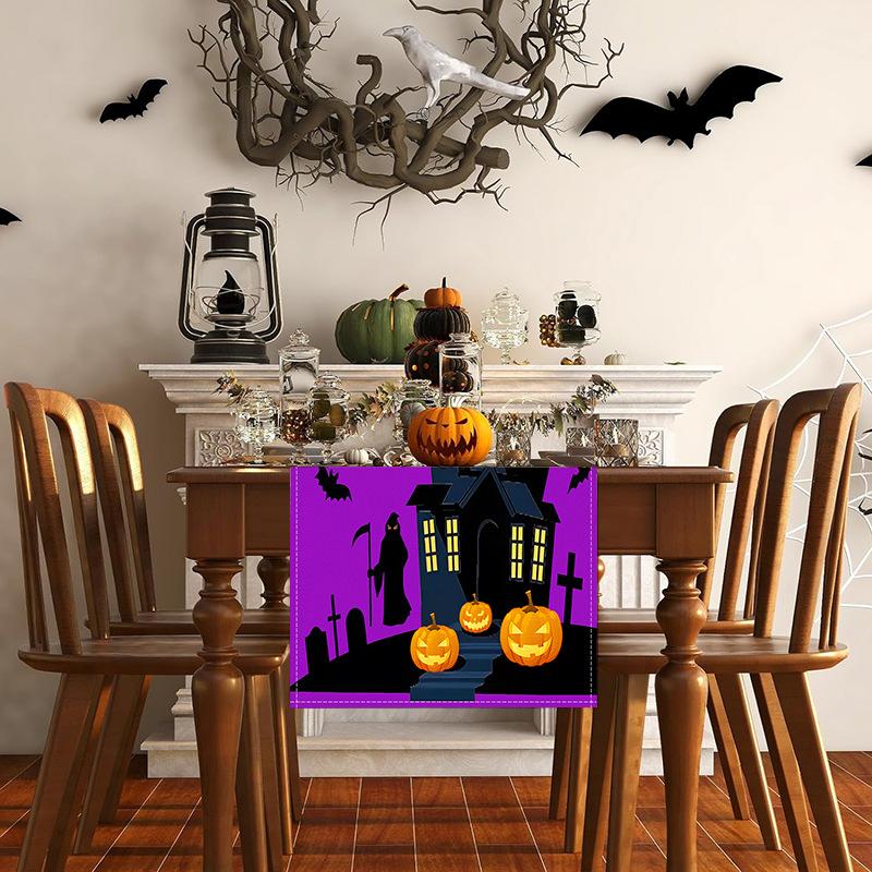 1pc Purple Halloween Table Runner with Castle Ghost Pattern Dustproof Durable Tablecloth for Halloween Dining Room Decoration