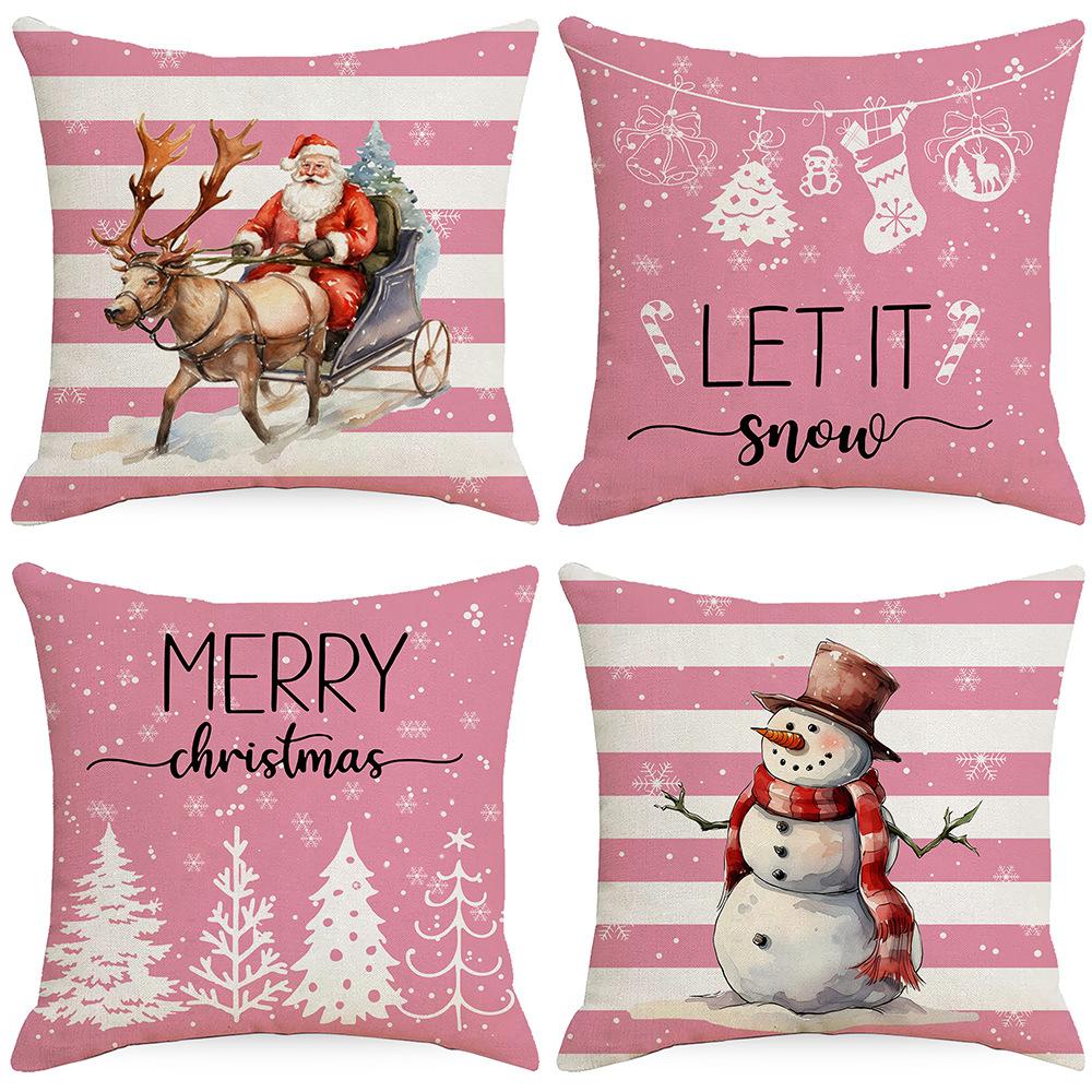 1pc Pink Christmas Cushion Cover Snowman Deer Pine Printed Washable Cover for Home Ornament Xmas New Year Christmas Decoration