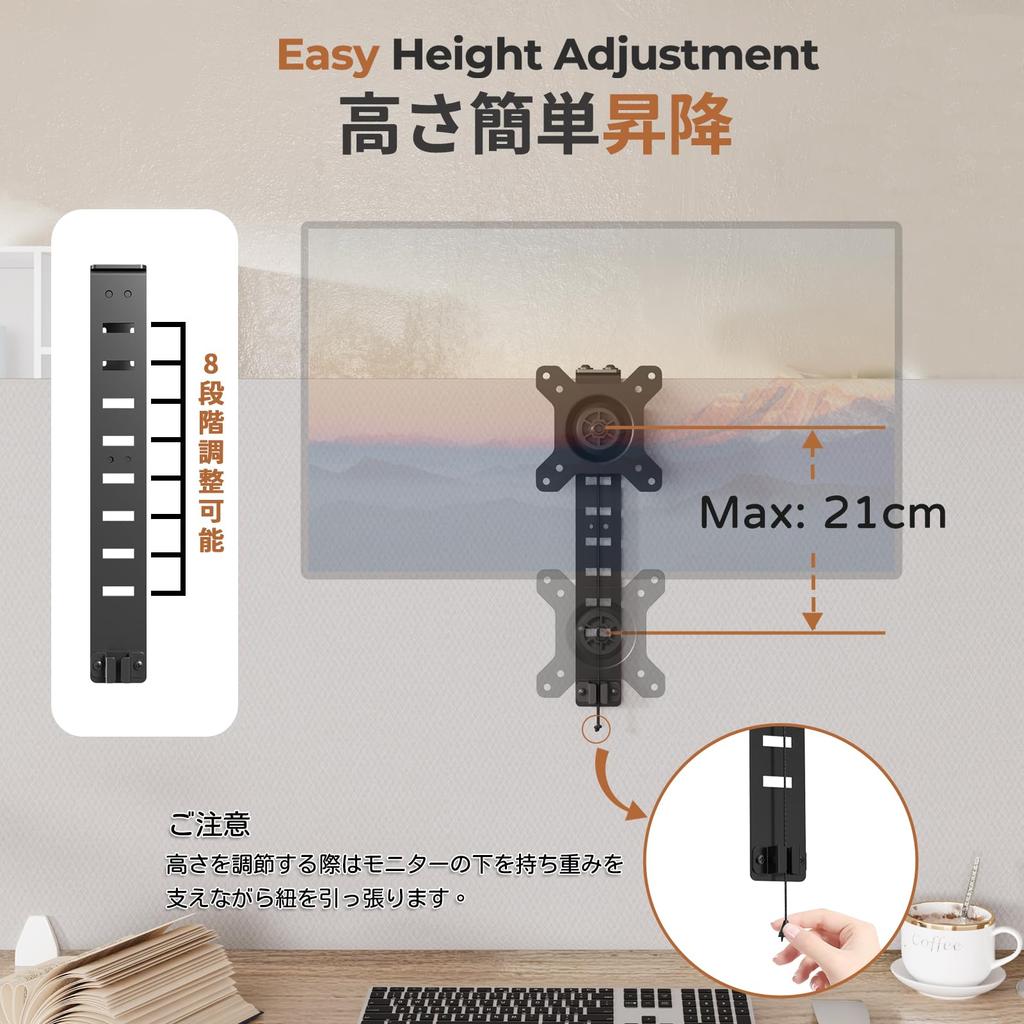 [Регулировка угла и высоты] Прикрепив монитор к этому кронштейну для ПК-монитора, вы сможете эффективно использовать пространство. Крепление VESA может поворачиваться на 360°, позволяя регулировать экран в портретной или альбомной ориентации, с регулировкой наклона ±15° вверх, вниз, влево и вправо.. Кроме того, высоту можно регулировать в 8 шагов (максимальный диапазон регулировки: 33см).