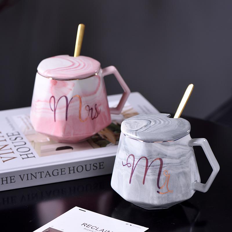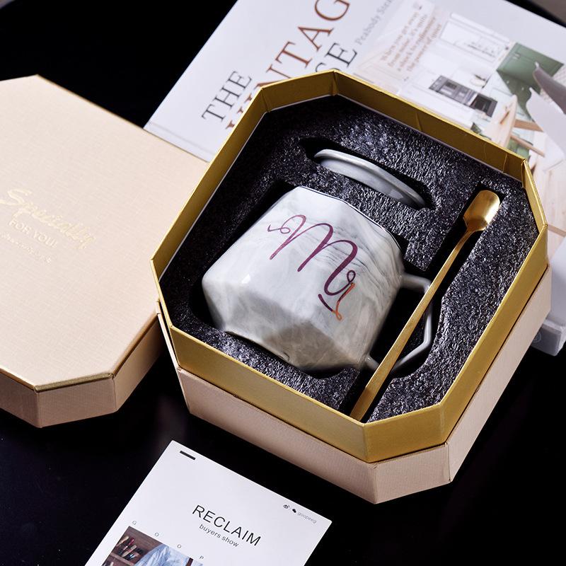 Керамическая кружка под мрамор с алмазным напылением, кофейная кружка с крышкой и ложкой, подарочная коробка