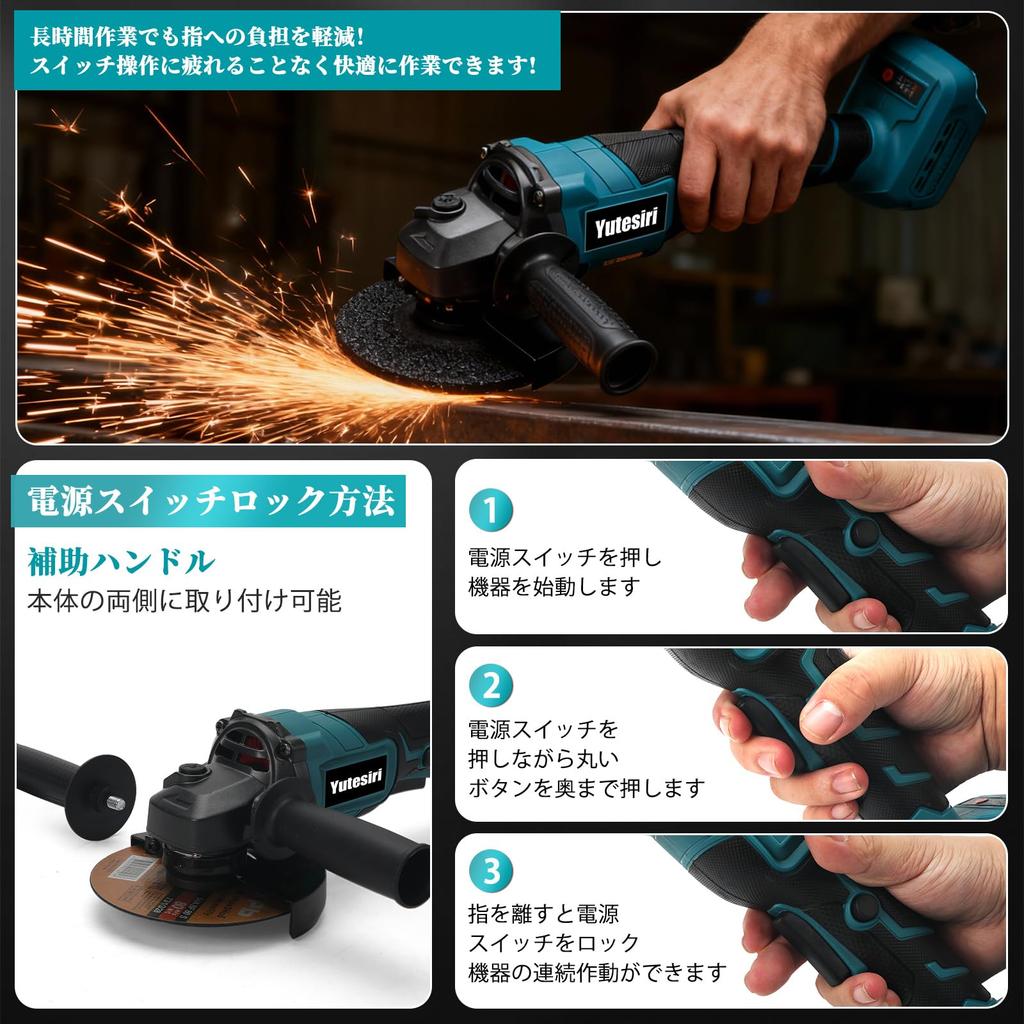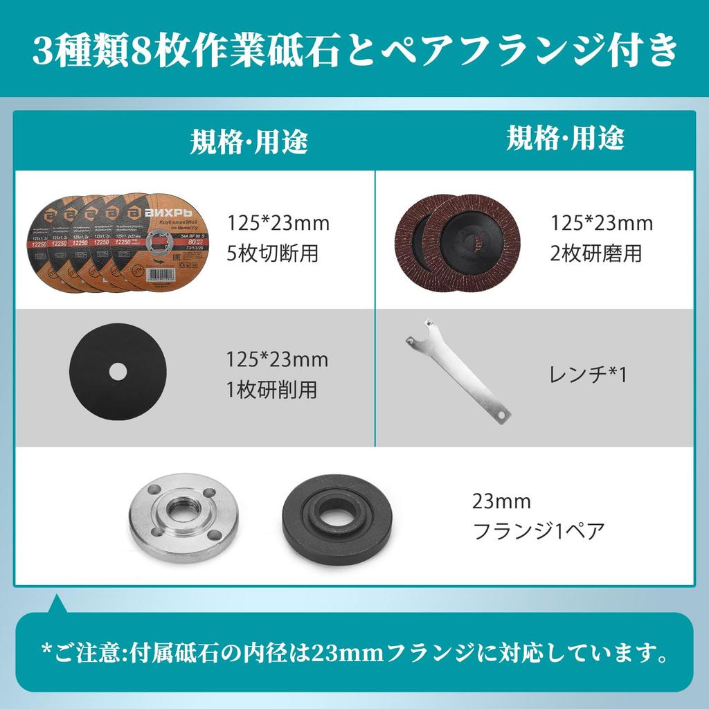 [Safe and Secure Use] Safe and secure, the protective cover prevents sparks, ensuring hand safety and allowing for easy operation at various angles. It features an excellent cooling structure to prevent overload. The soft rubber grip is dustproof, non-slip, and prevents drops and injuries. Accessories include one wrench, eight grinding stones, two pairs of flanges and an installation screwdriver/wrench, and one handle. Unit dimensions (approx.) 33*23*13cm; unit weight 1.3kg; compatible disc size: outer diameter 125mm, inner diameter 15/16mm. We offer a one-year warranty. If you have any issues with the product, please feel free to contact us.