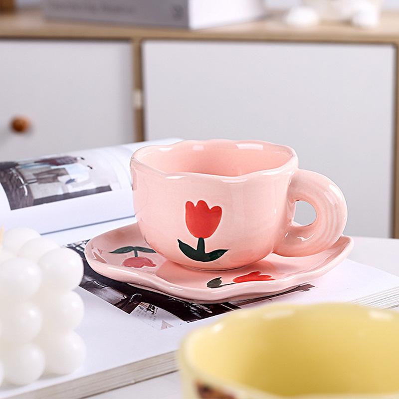 Маленький свежий розовый кофейный набор из чашки и блюдца с тюльпаном, чашка для питья для девочек, чашка для послеобеденного чая, чашка для латте в качестве сувенира