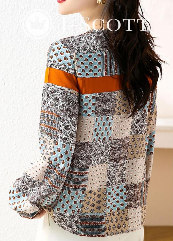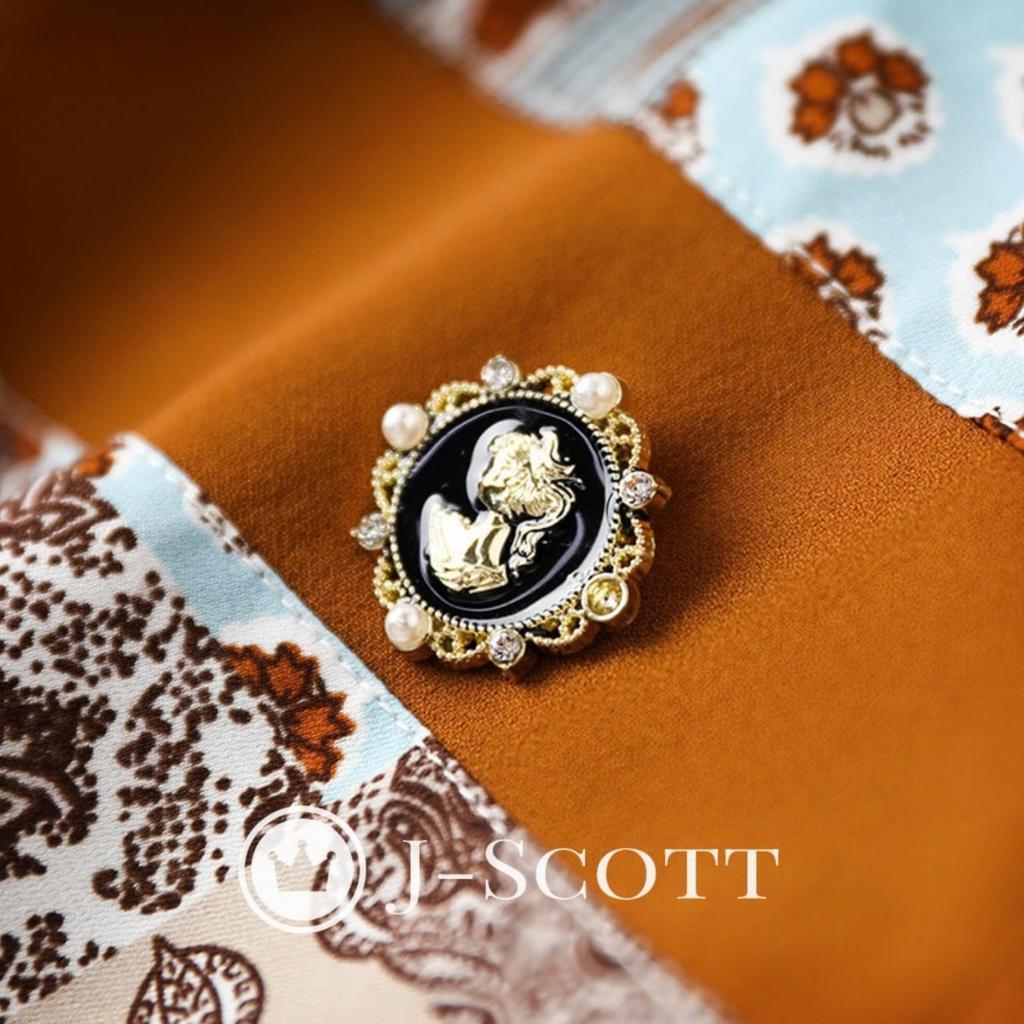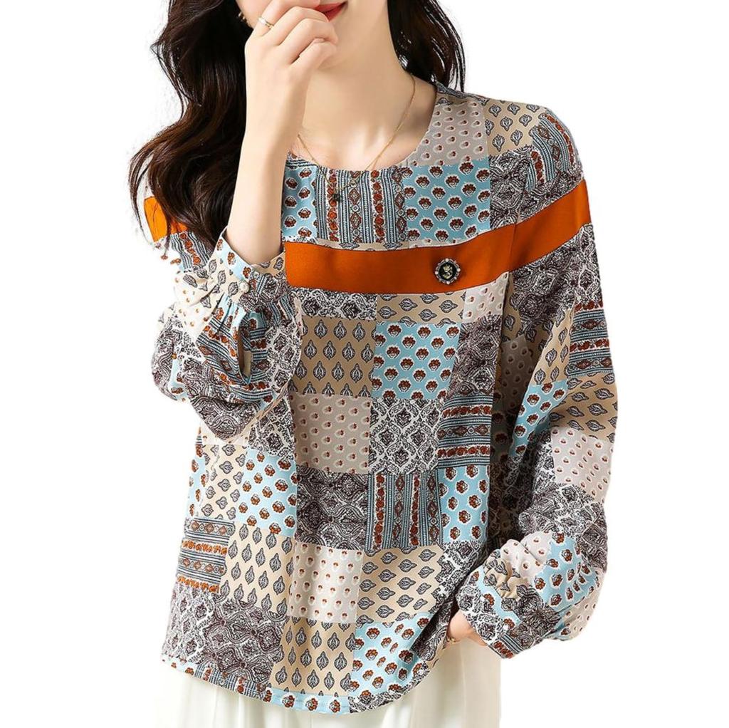 Блузка пэчворк J-Scott с брошью, жемчужными пуговицами, принтом Прованс, круглым вырезом, длинными рукавами, коричневая (JS79-BR-M) - Ограниченный запас