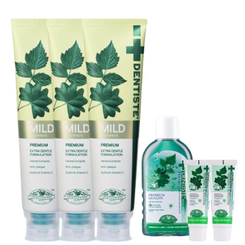 В этот набор входят три полноразмерных тюбика (200г), два тюбика дорожного размера (20g), и 100 мл травяной ополаскиватель для рта, что делает его идеальным как для домашнего использования, так и для путешествий.