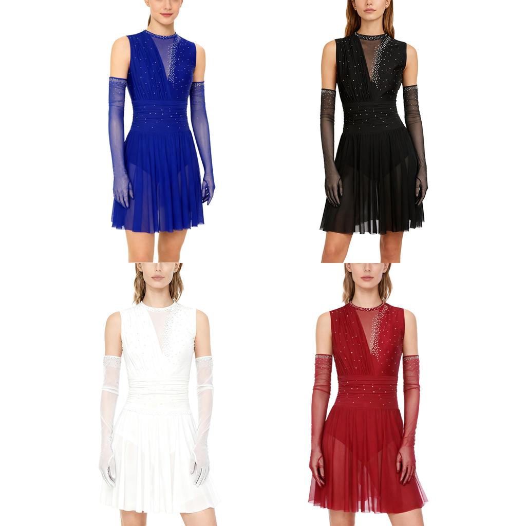 Женское платье для фигурного катания, длинные перчатки, без рукавов, с блестящими стразами, с вырезом на спине, юбка-купальник — купить товар онлайн с бесплатной доставкой по всему миру!