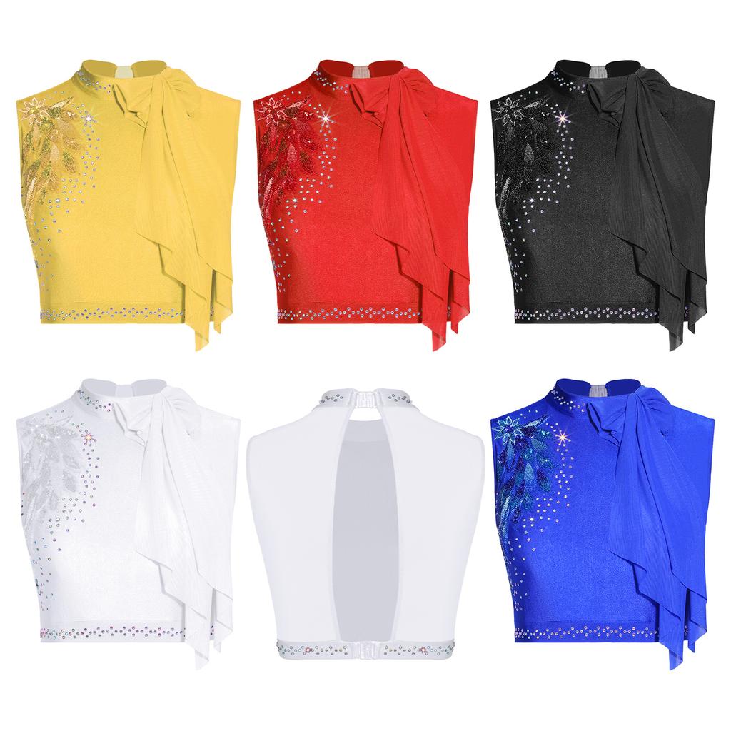 Женский современный танцевальный кроп-топ с пайетками, вышивкой, декором в виде банта, без рукавов, с вырезом на спине, танцевальная одежда