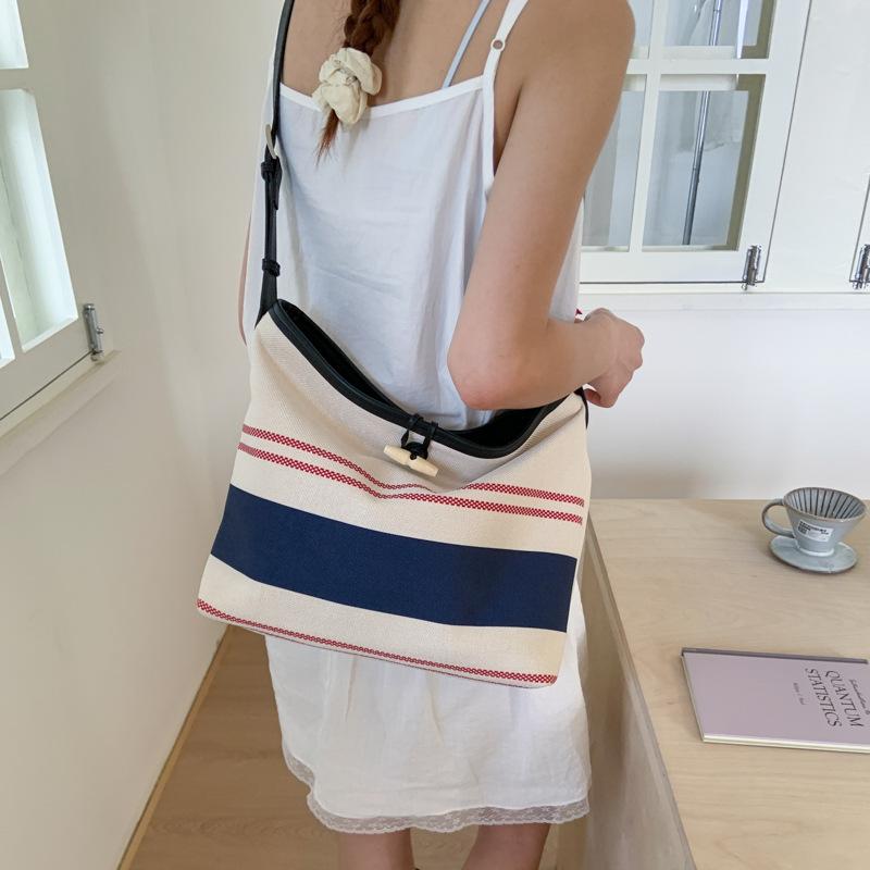 New high-end canvas bag, striped bucket bag, large-capacity underarm bag, casual messenger bag splicing shoulder bag tide
