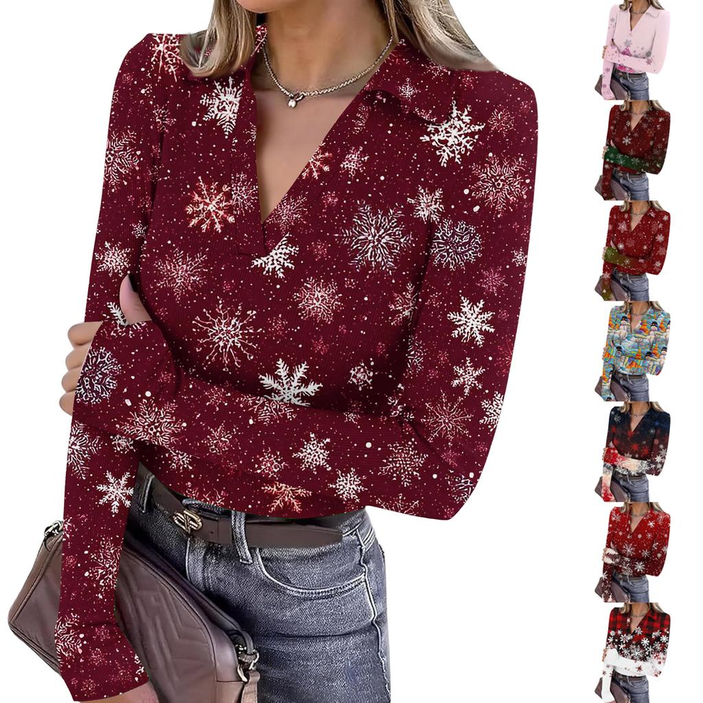 Женская модная повседневная блузка с V-образным вырезом, длинными рукавами и принтом на рождественскую тематику, застегивающаяся на пуговицы