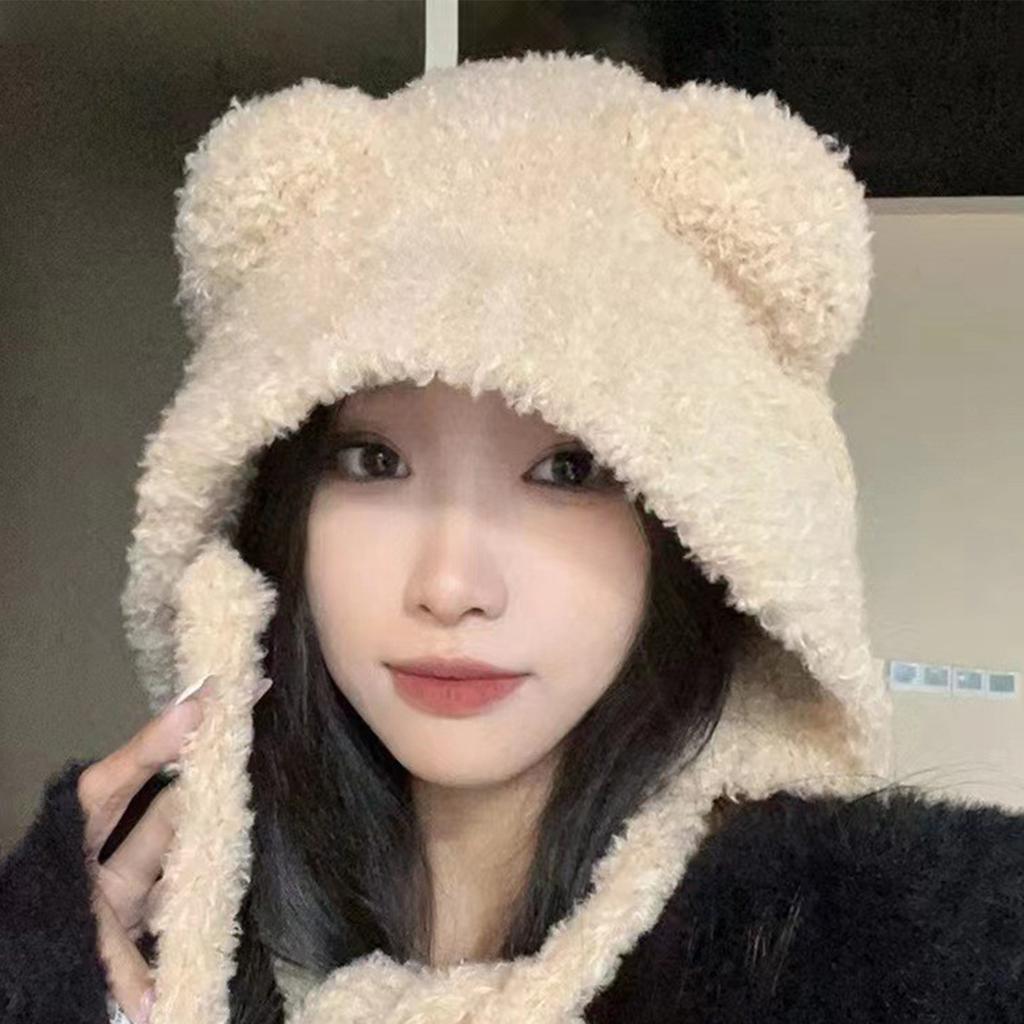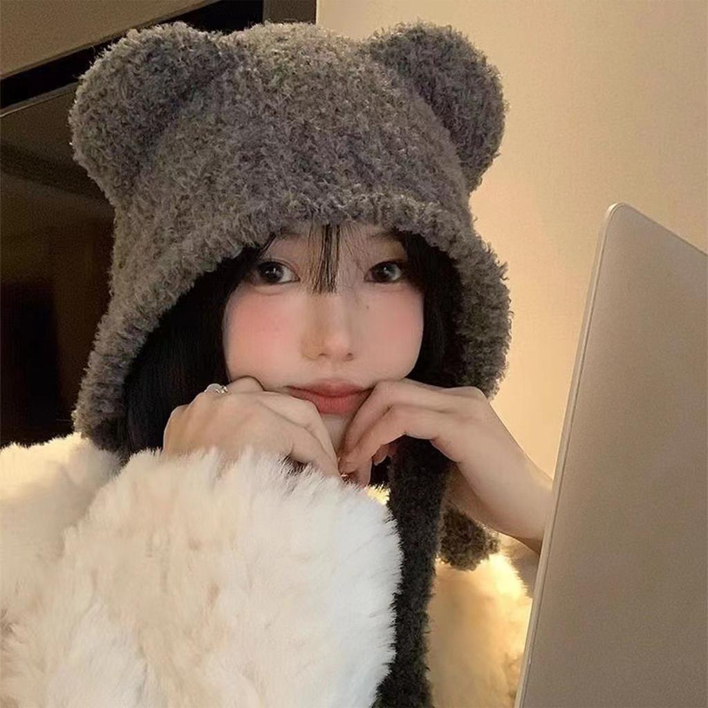 Женская плюшевая шапка с ушками, милая и универсальная вязаная шапка для женщин