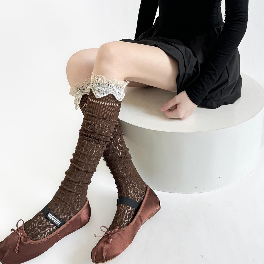 Японские - Ретро кружевные гольфы до колена в клетку ромбами с вырезами для женского лета, тонкие и красивые носки для икр.