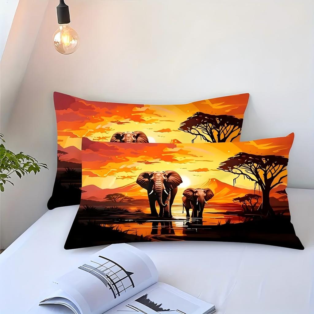 Sunset Mountain Range African Grassland Elephant Duvet Cover Soft Comfortable Bedding Set Wildlife Theme Quilt Cover Pillowcase