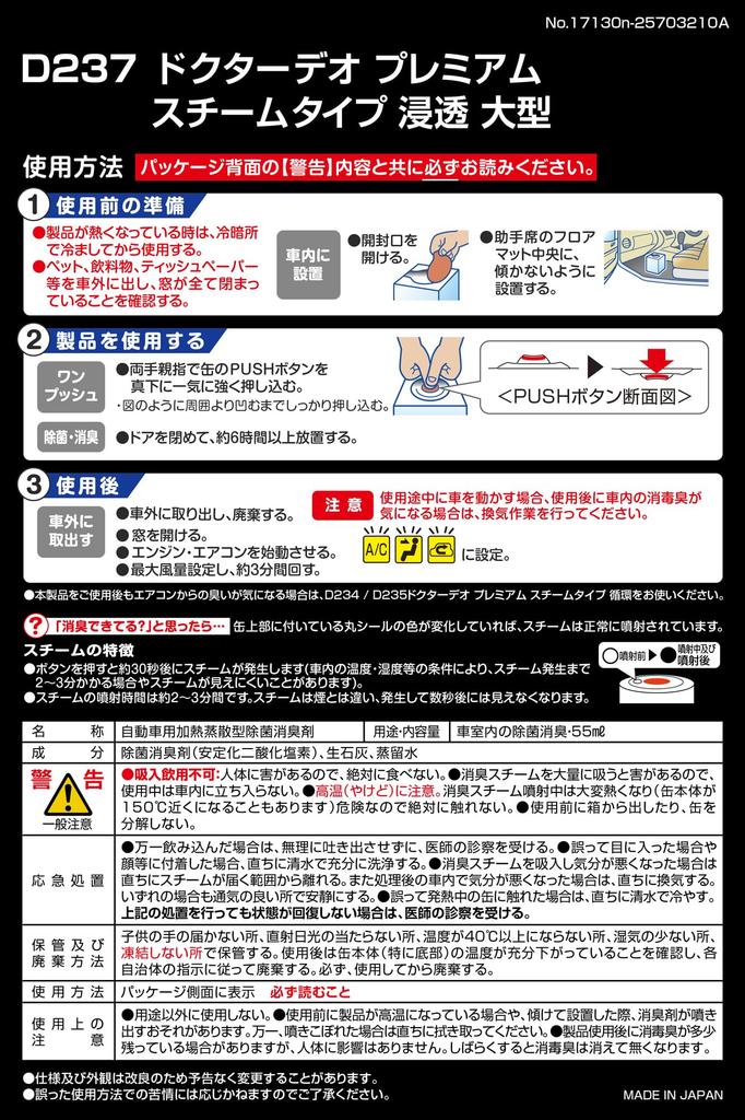 [Мощно удаляет запахи, проникшие в сиденья и салон!!] ШАГ 1: Мощно распыляет дезинфицирующие и дезодорирующие ингредиенты вместе с паром! ШАГ 2: Дезинфицирующие и дезодорирующие ингредиенты распространяются, заполняя салон автомобиля! ШАГ 3: Окислительно разлагает молекулы запаха! Доктор. Дезодорант использует стабилизированный диоксид хлора. Дезодоратор, который не маскирует запахи отдушкой. Доктор. Дезодорант окисляет и разлагает молекулы запаха, витающие в воздухе.. Он также эффективно удаляет бактерии и вирусы. «Стабилизированный диоксид хлора» также используется в коммерческих целях в медицинских учреждениях и ресторанах. Доктор. Дезодорант разработан так, чтобы быть одновременно мощным и безопасным.