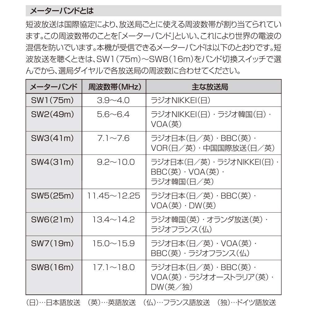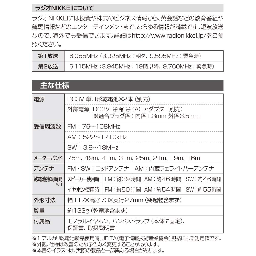 [Особенности] ● Коротковолновое радио, позволяющее слушать информацию со всего мира в Японии и по всему миру ● Поддерживает все шесть диапазонов Radio Nikkei ● Принимает всего 10 диапазонов: AM, FM и 8 КВ диапазонов ● Поддерживает Wide FM (Дополнительное FM-вещание) ● Совместим с батареями или питанием от сети переменного тока ● Оборудован стержневой антенной FM/SW