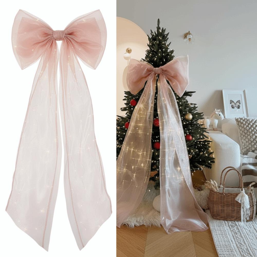 1. Потрясающий визуальный эффект для праздничной атмосферы:Этот большой перламутровый тюлевый бант-украшение обладает сияющим блеском, который красиво улавливает и отражает свет, мгновенно создавая праздничную рождественскую атмосферу.. При развешивании на рождественских елках, фоновых арках, венках или использовании в качестве гирлянд и серпантина, он создает гламурный, привлекающий внимание фокус, который делает все украшение более ярким и праздничным.