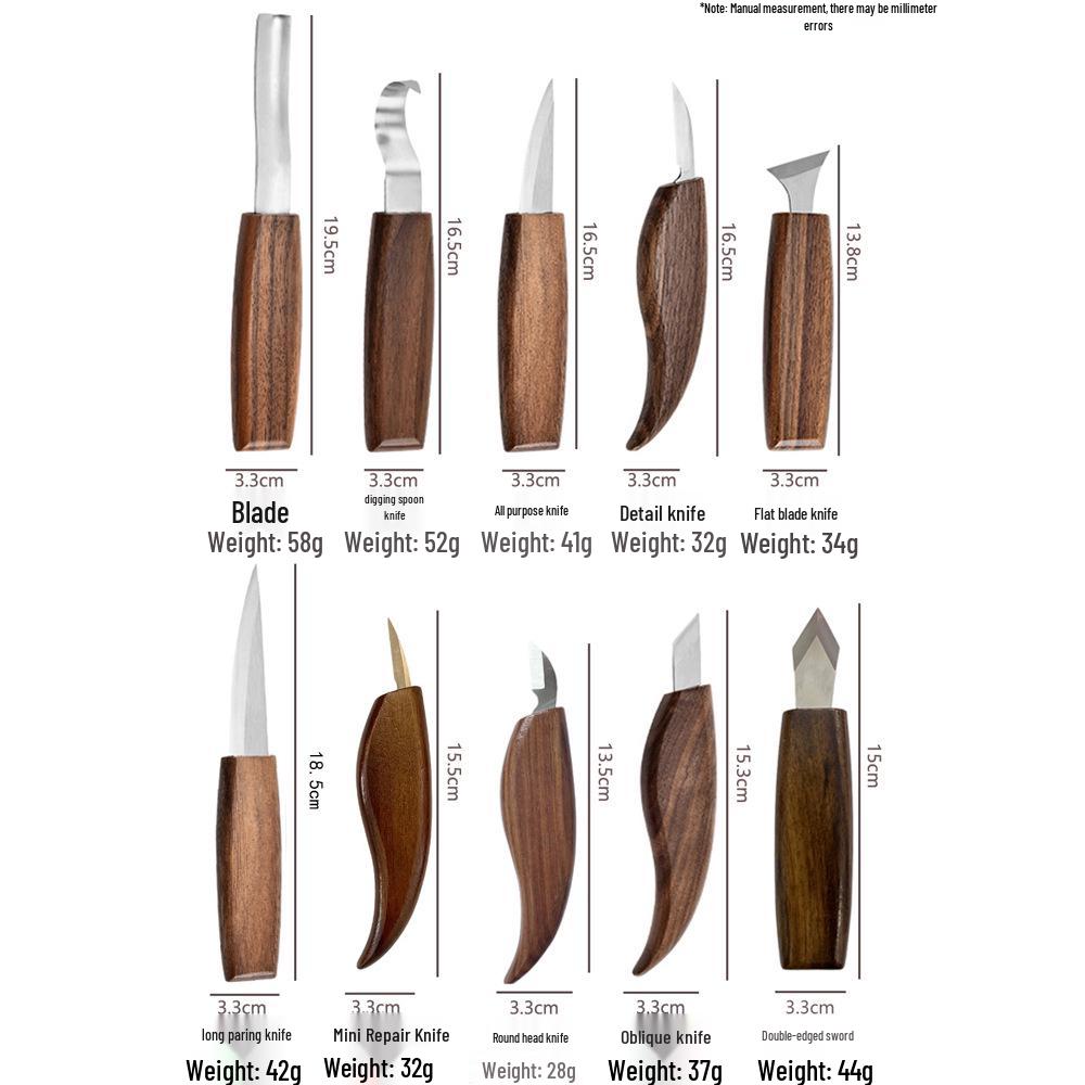 Набор ножей для резьбы по дереву с квадратной рукояткой - Включает ложкорез, стамеску, универсальный нож и деталировочный нож для ручной работы по дереву.