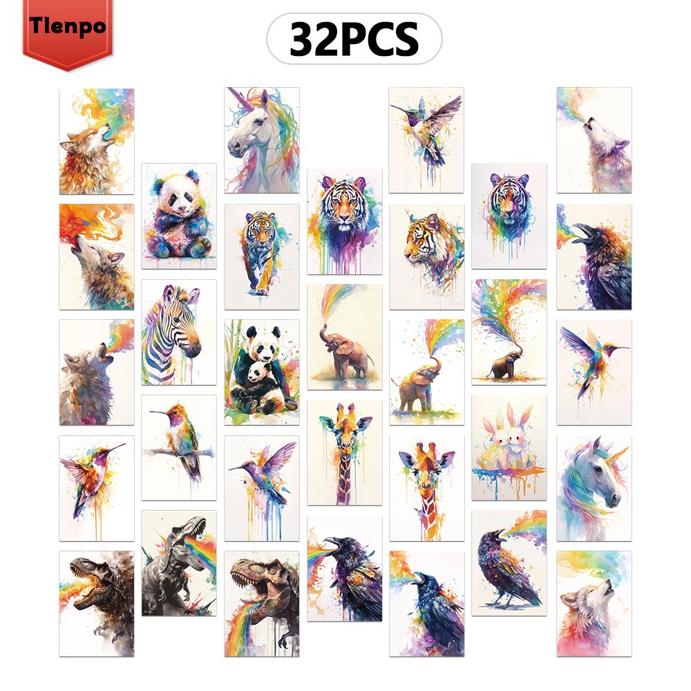 32pcs, watercolor animal rainbow postcards, greeting cards, DIY postcards, decorations, suitable for collection and gifting.