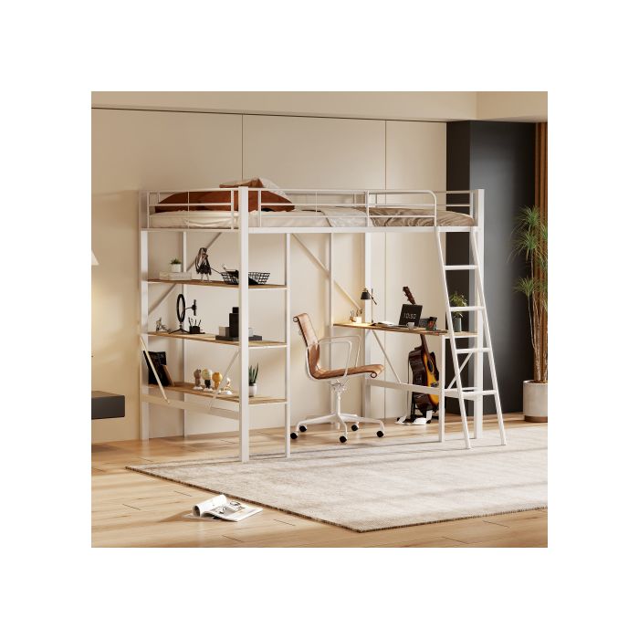 Lit mezzanine - MUVOE - 90x200 cm - Métal blanc - Bureau intégré - 3 étagères — купить товар онлайн с бесплатной доставкой по всему миру!
