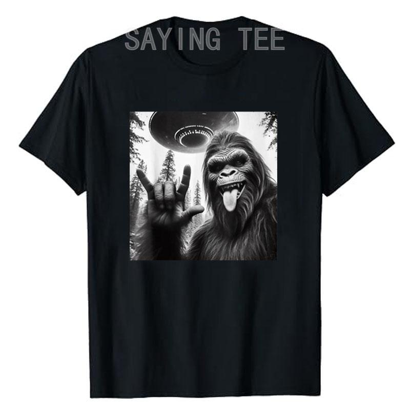 Funny Sasquatch Bigfoot Rock on Selfie with UFO Alien T-Shirt Humorous Father's Day Daddy Gift Short Sleeve Awesome Saying Tee — купить товар онлайн с бесплатной доставкой по всему миру!