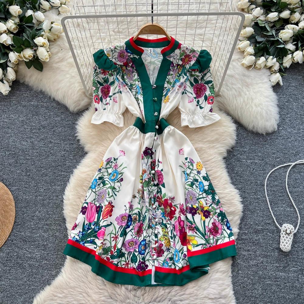 Летние женские платья с винтажным принтом, подиумные, с V-образным вырезом, на одной пуговице, мини, короткое, для вечеринки