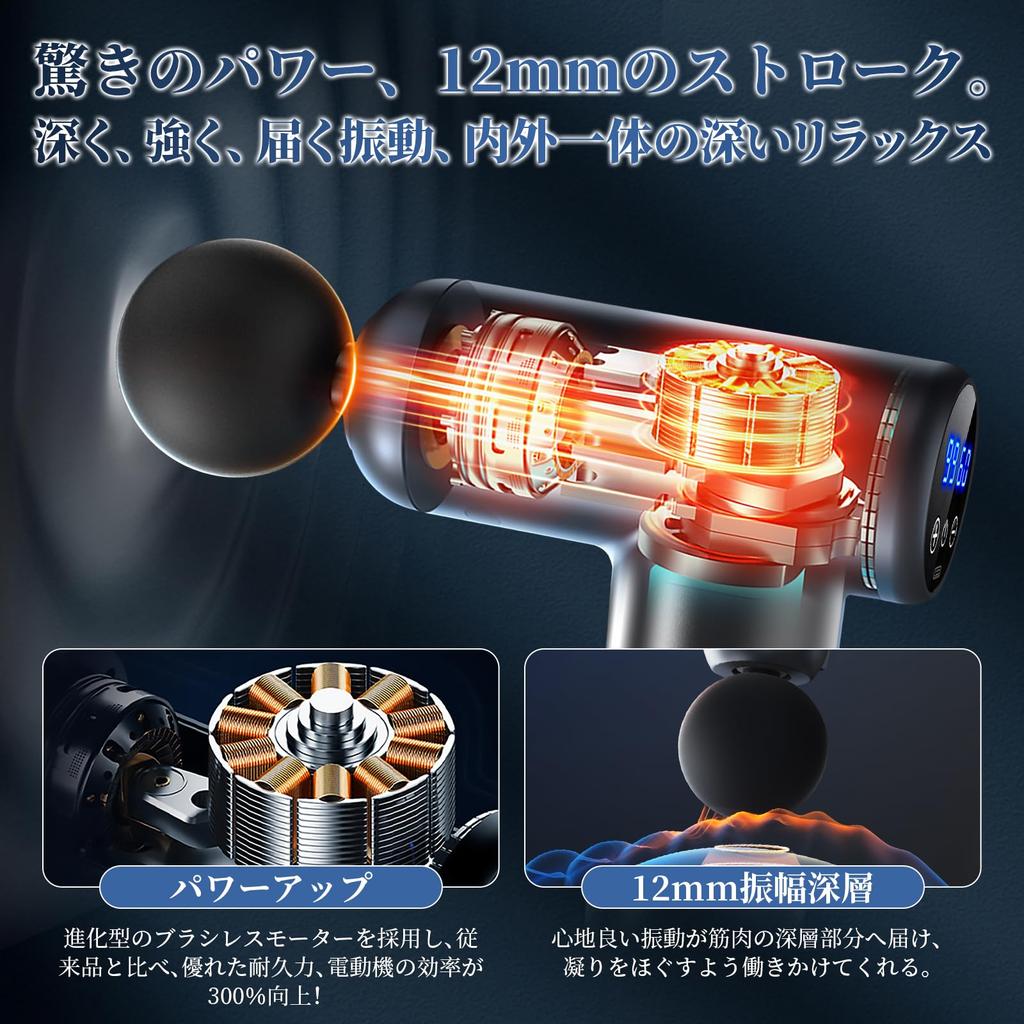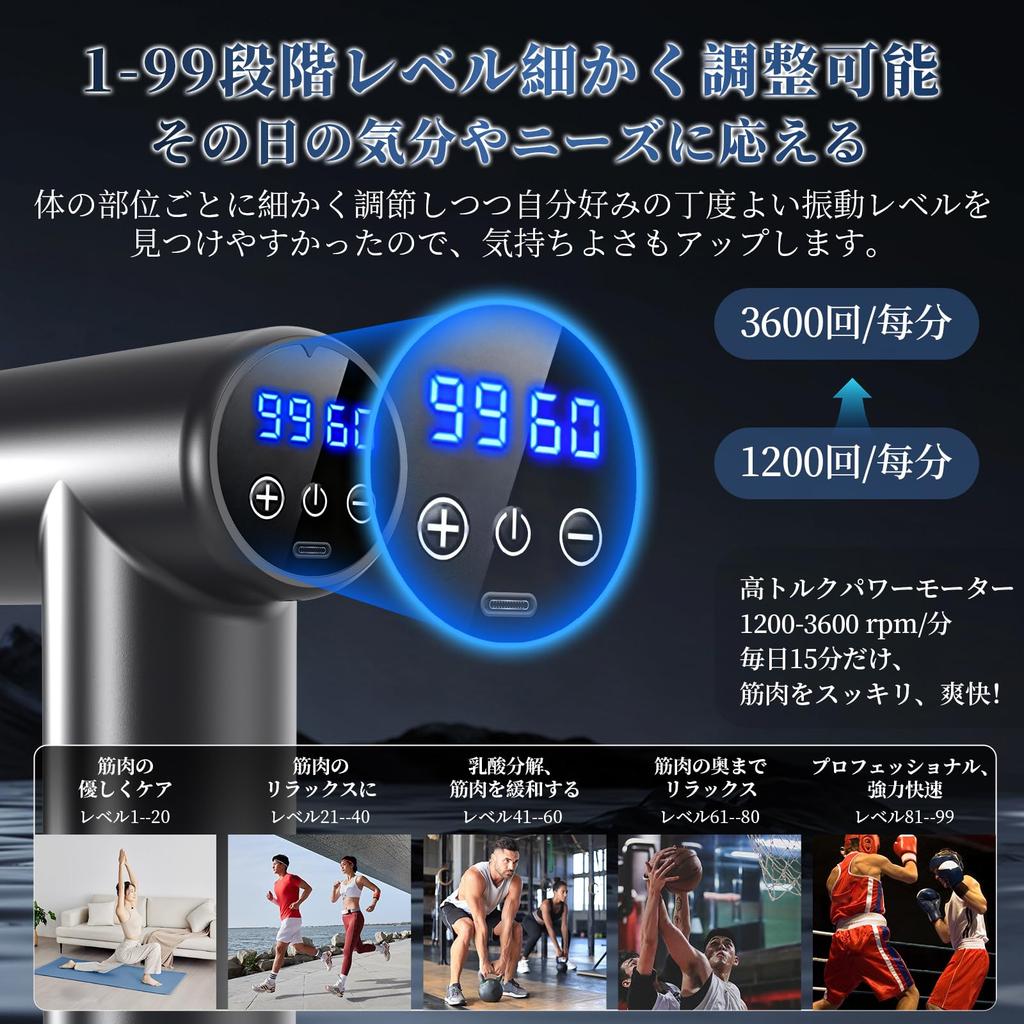 [Amazing power and comfortable vibrations reach deep into your muscles] Munyday's fascia release electric gun uses a high-performance, evolved brushless motor, boasting superior durability and 300% improved motor efficiency compared to conventional models! This fascia release gun's larger 12mm amplitude delivers vibrations deep into muscles, effectively treating muscle tension and relieving shoulder and back pain. Powerful vibrations up to 3600 times per minute reach deep into muscles that are normally not used. Recommended for post-exercise cooling down, lightly pressing against overworked arms and legs will refresh your body and mind. The wide intensity adjustment range from 1 to 99 makes it easy to adjust to the day's fatigue and accommodate each family member's physique and preferences. High-speed vibrations target muscles. With vibrations ranging from 1200 to 3600 times per minute, it's recommended for those who regularly train and want to thoroughly care for their muscles. You can choose the vibration, amplitude, and attachments depending on your preferences that day, so you can thoroughly relax your entire body.