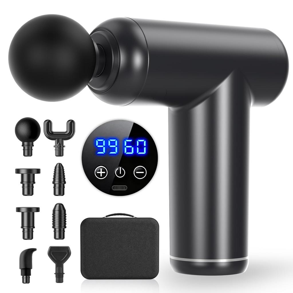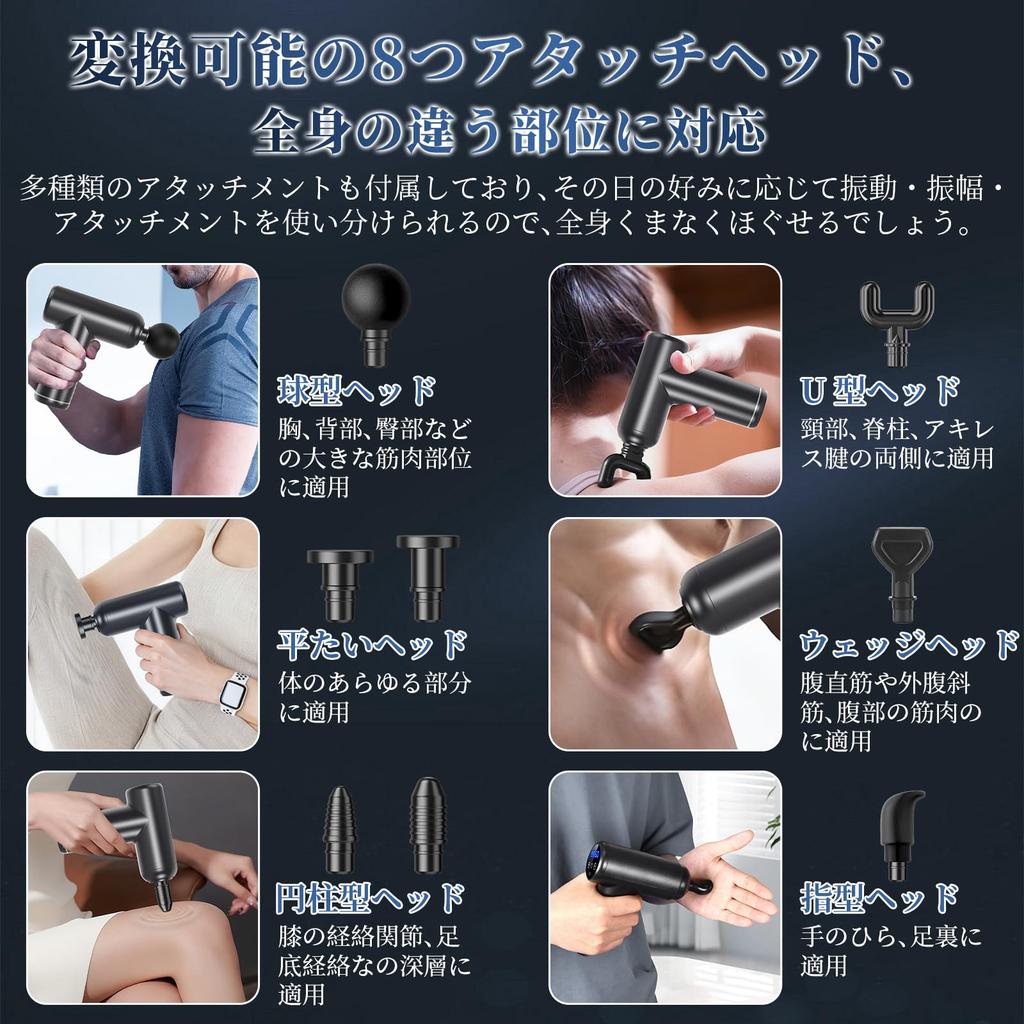 [8 Types of Myofascial Release Heads - Full Body Care with One Device] This powerful gun can be used to treat the entire body. It comes with 8 interchangeable attachments, allowing you to use it on different parts of the body, changing the attachments to suit your specific needs. The compact and lightweight fascia gun delivers pleasant vibrations that target deep muscles to release stiffness. It can also be used on the entire body, including the shoulders, hips, knees, face, and calves. The spherical, flat, U-shaped, and cylindrical attachments fit various muscles throughout the body. The vibration intensity can be adjusted from 1200 to 3600 times per minute, allowing you to adjust the vibration intensity to your liking. Enjoy comfortable stimulation for various muscles, including the shoulders, thighs, and ankles.