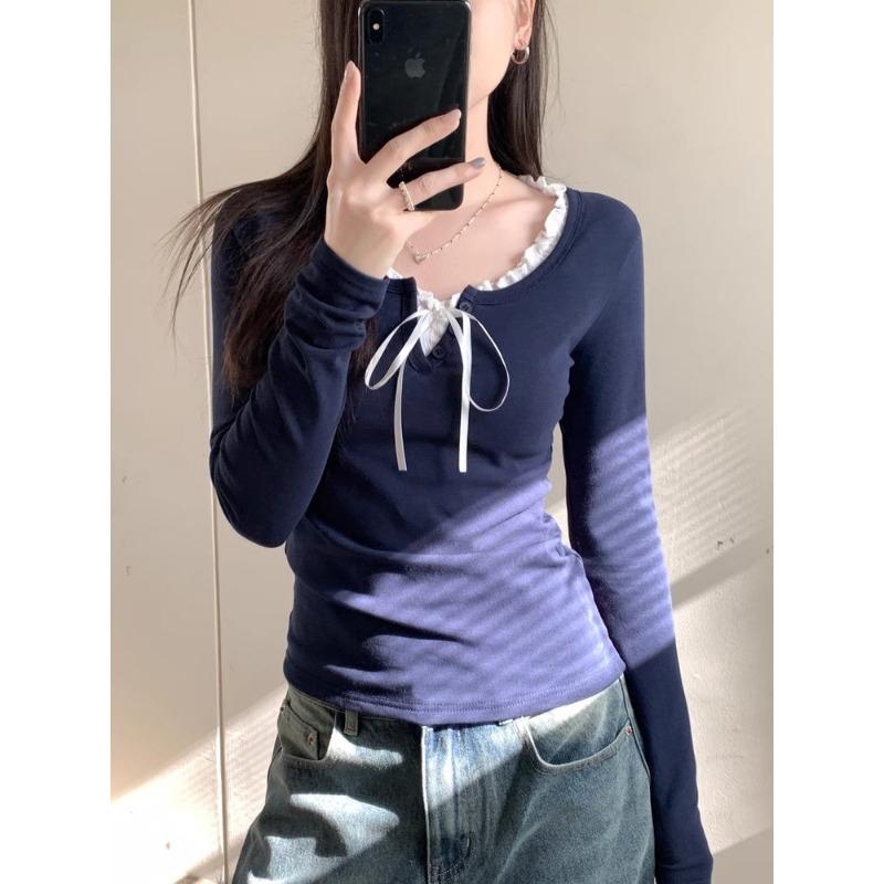 Весна Осень Рюши Шнуровка Пэчворк Футболка Женская Повседневная Модная Пуловер Футболка Длинный Рукав Базовая Майка