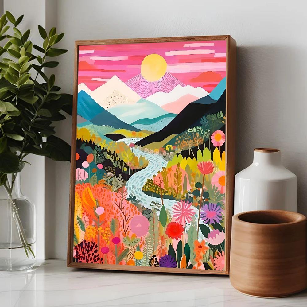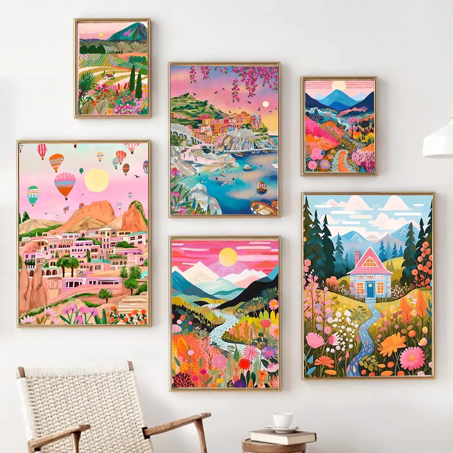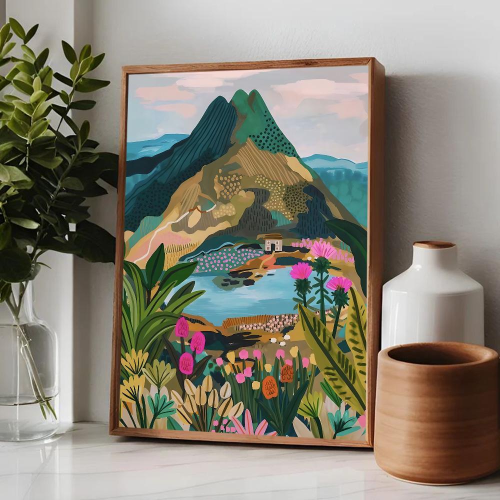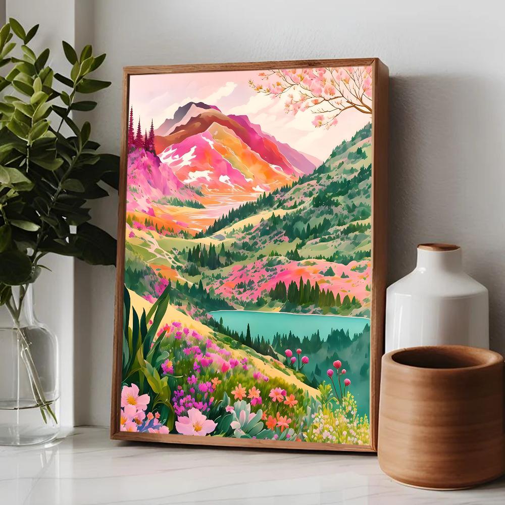 Цветной постер Горы Озеро Цветы Пейзаж Природа Путешествия Декор Постер Качество HD Настенное искусство Ретро постеры для декора дома комнаты