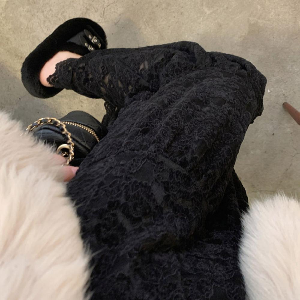 Длинная юбка с кружевными ярусами на флисовой подкладке – кремовая/черная, из Кореи