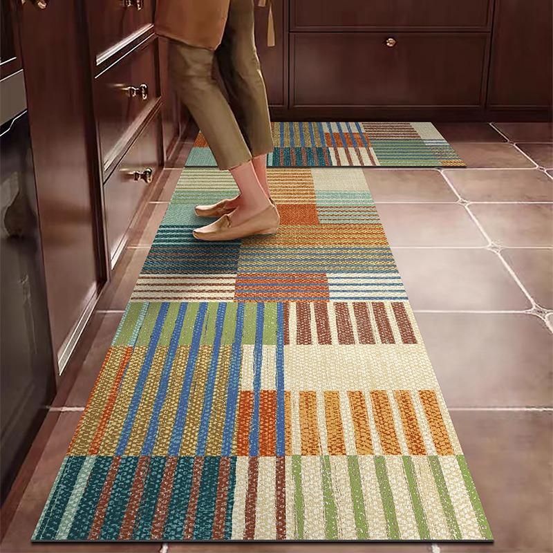 ПВХ Кухонный Ковер Водонепроницаемый Кожаный Коврик для Пола Маслостойкий Нескользящий Длинные Коврики для Ног Цветные Полосы Этнический Стиль Домашний Декор Ковер