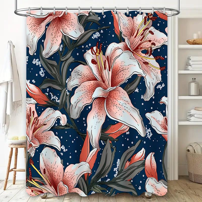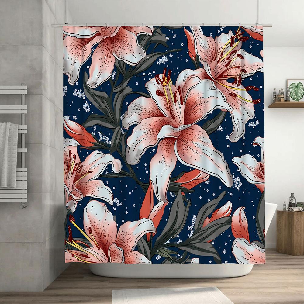 Стильная шторка для ванной с цветочным дизайном розовых тигровых лилий для современного декора ванной комнаты, набор водонепроницаемых штор для душа темно-синего цвета