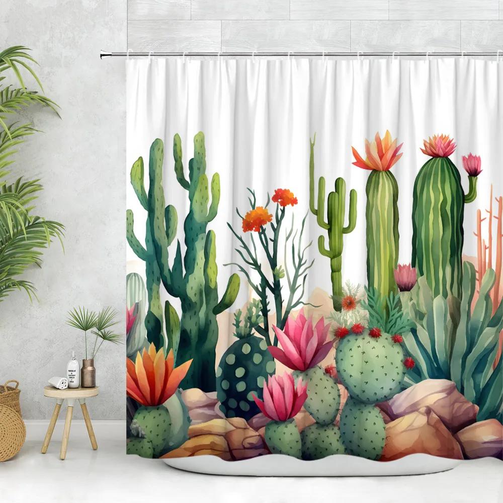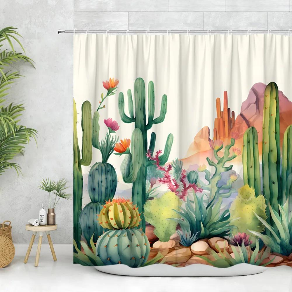 Кактус Занавеска для душа Тропическое растение Зелень Лунный цветок Пустыня Колибри Деревенская деревянная панель Полиэфирная ткань Декор для ванной