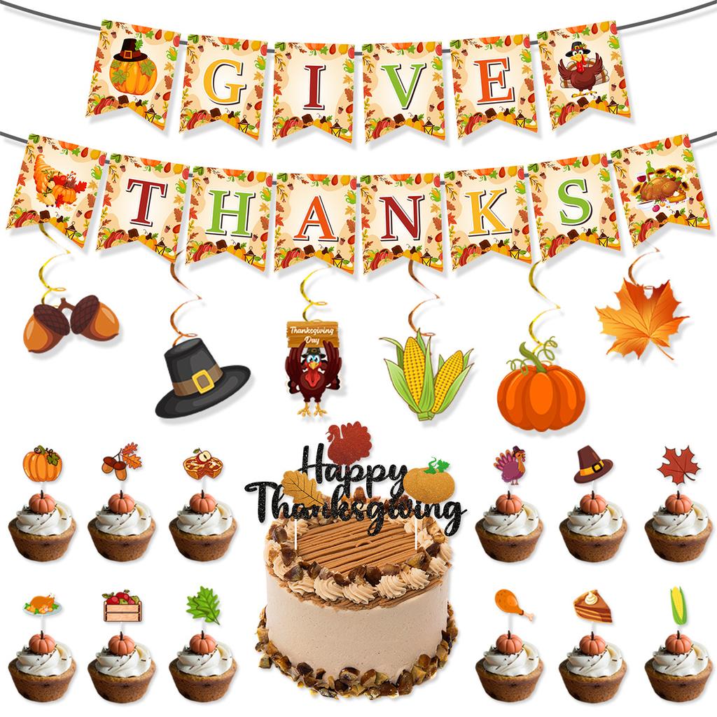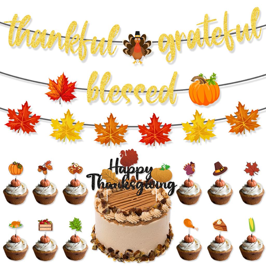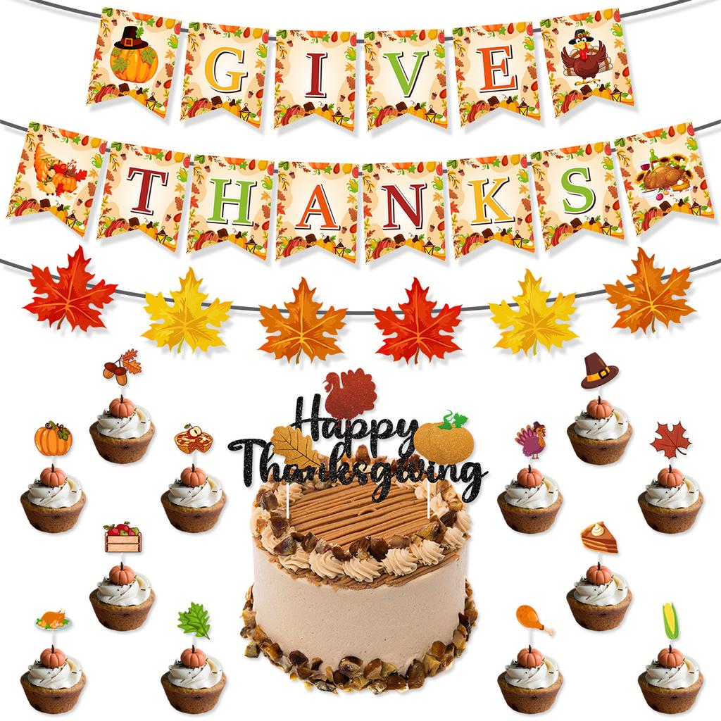 Thanksgiving Decoration Autumn Maple Leaf Pumpkin Flag Balloon Cake Card Set Customization