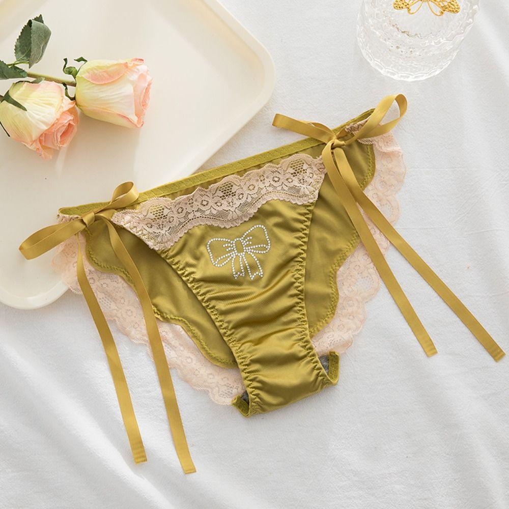 Crystal Bow Rhinestone Satin Panties Ice Silk Lace Briefs for Women Sweet Lace Tie Panties Girl