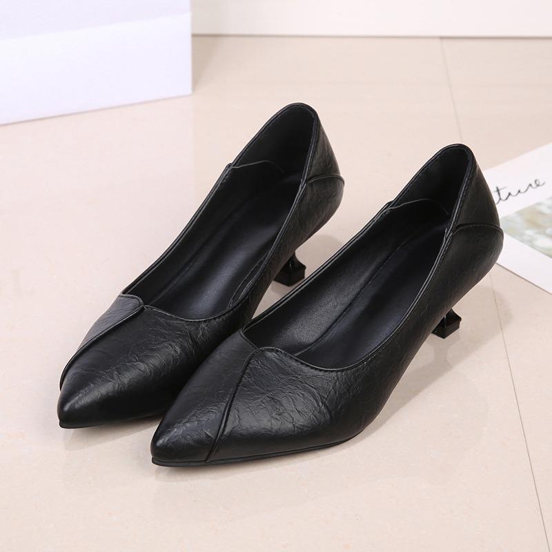 Неустающие ноги профессиональная женская обувь новая мягкая кожа высокие каблуки острый носок удобный средний каблук черные рабочие темпераментные туфли-лодочки