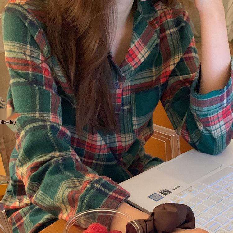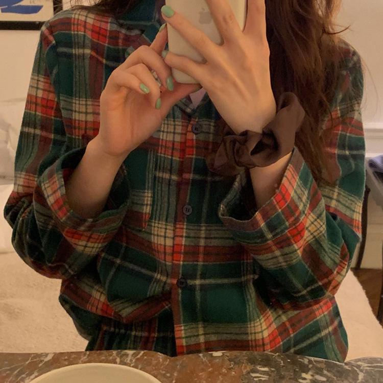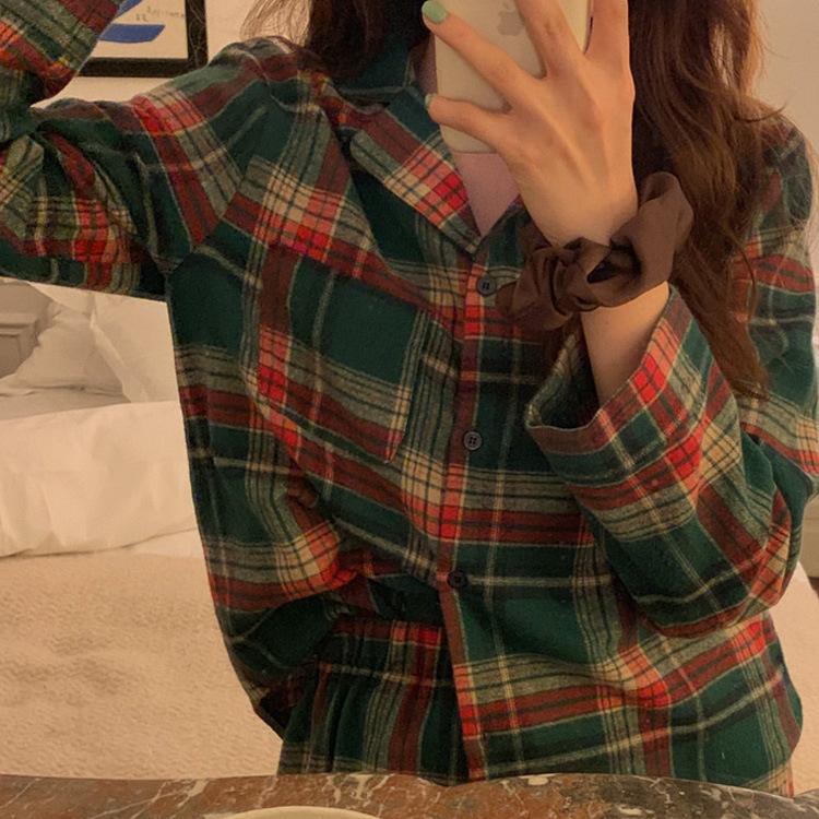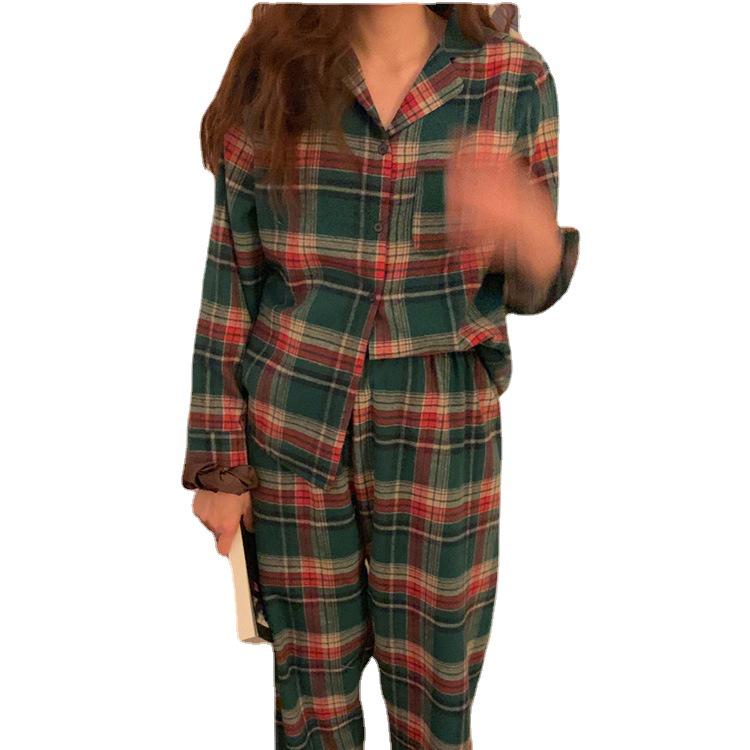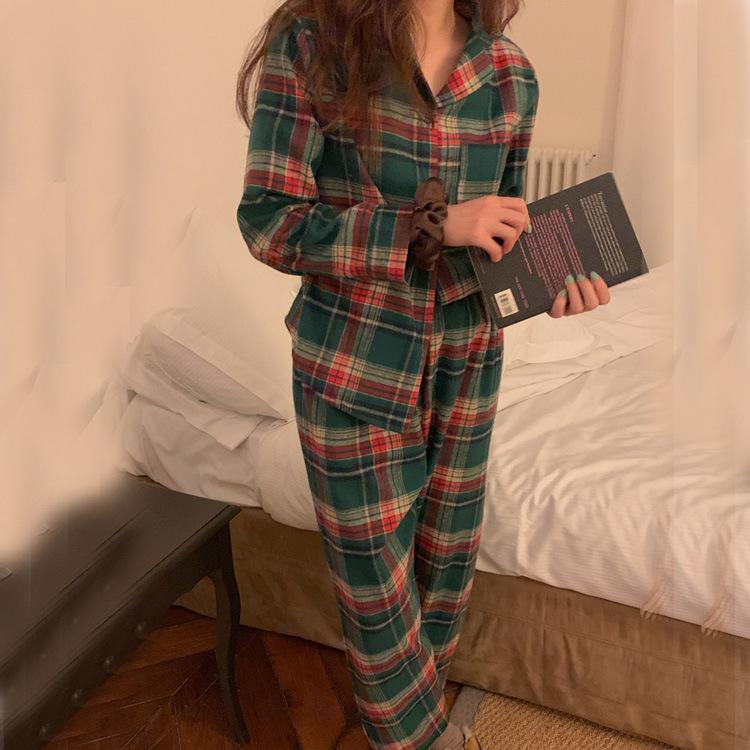 Осенне-зимний комплект парной пижамы в зеленую клетку - Топ с длинным рукавом и брюки