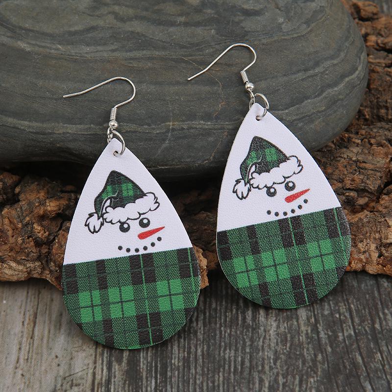 European & American Xmas Teardrop Green Plaid Leather Snowman Earrings