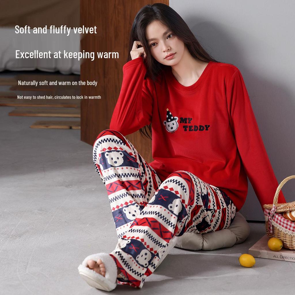 Оставайтесь в уюте и стиле в этих женских рождественских пижамах с мишками из красного бархата. Идеально подходит для осени, зимы и весны, этот комплект изготовлен из высококачественного полиэстера и оснащен мягким мехом из велюра Sea Island, обеспечивая комфорт и воздухопроницаемость в холодное время года.. Эти пижамы с длинными рукавами для дополнительного тепла идеально подходят для уютного отдыха дома, предлагая восхитительное сочетание комфорта и праздничного очарования.