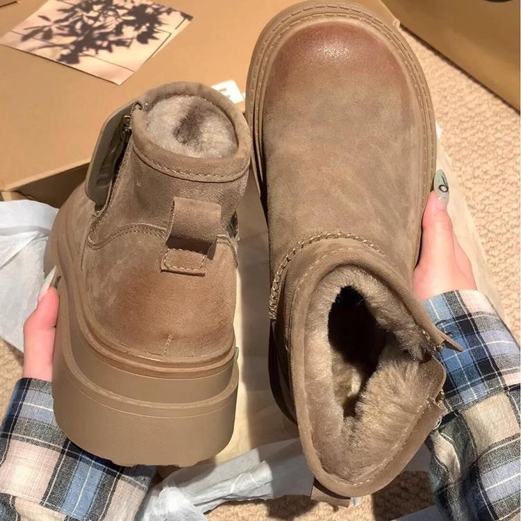 [Странный эстетизм] Кожаные меховые зимние ботинки на толстой подошве с внутренней танкеткой, женские новые бархатные и утолщенные хлопковые туфли на осень и зиму