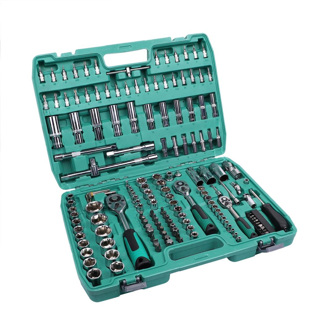 [Комплектация] 6,3 мм (1/4") комплект гнезд: 13 головок на 4, 4.5, 5, 5.5, 6, 7, 8, 9, 10, 11, 12, 13 и 14 мм; 13 глубоких головок на 4, 5, 6, 7, 8, 9 и 10 мм; 5 головок типа E размеров E4, E5, E6, E7 и E8; Набор торцевых головок 9,5 мм: 10 головок размеров 10, 11, 12, 13, 14, 15, 16, 17, 18 и 19 мм; 6 глубоких головок на 10, 11, 12, 13, 14 и 15 мм; Торцевые головки типа E в размерах E10, E11, E12, E14, E16 и E18 Всего 6 штук. Набор торцевых головок 12,7 мм: 17 штук в 10, 11, 12, 13, 14, 15, 16, 17, 18, 19, 20, 21, 22, 24, 27, 30 и 32 мм; 5 штук в 16, 17, 18, 19 и 22 мм глубоких головках; 2 штуки в розетках типа E: E20 и E24. 30 торцевых головок, набор из 44 бит, 7 шестигранных ключей, 5 удлинителей, 3 трещоточные рукоятки, 3 свечных головки, 3 универсальных шарнира, 1 Т-образная рукоятка, 1 вращающаяся рукоятка, 3 упругих стержня и 1 адаптер.