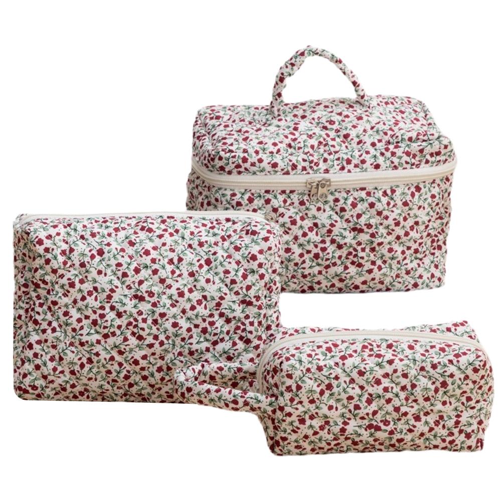 3 шт. Цветочная косметичка Хлопковая стеганая сумка для туалетных принадлежностей Большой вместимости Органайзер для макияжа Сумка для хранения на молнии для женщин и девушек