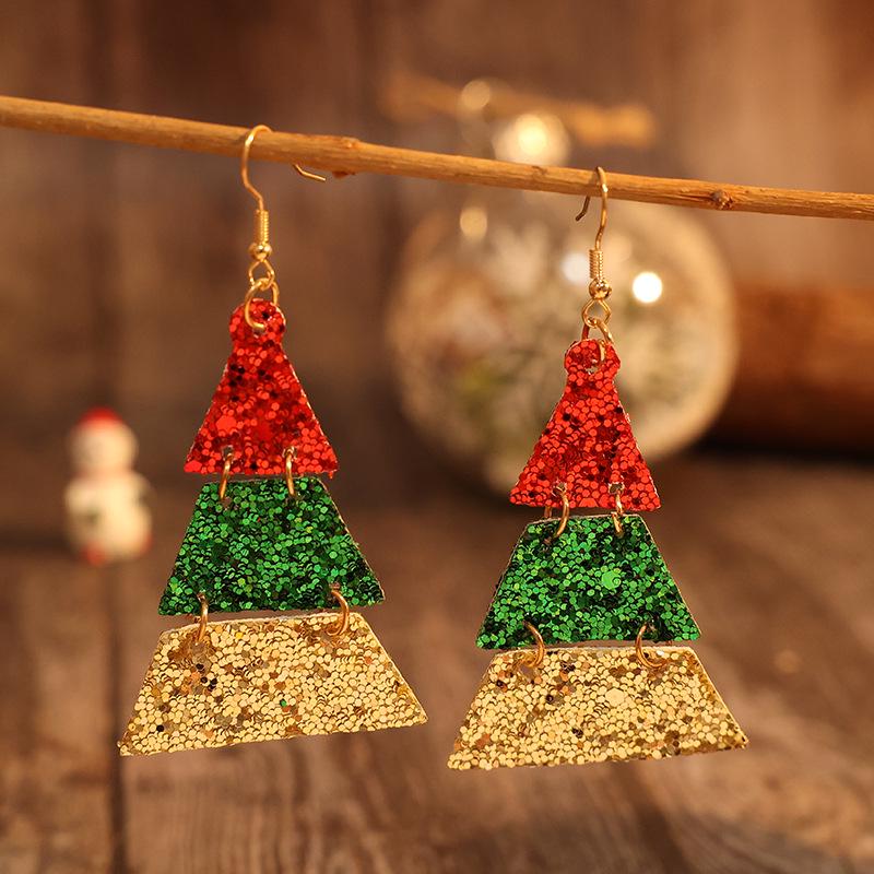 European and American Sequin Christmas Tree Leather Earrings - Three-Layer Spliced Trendy Design