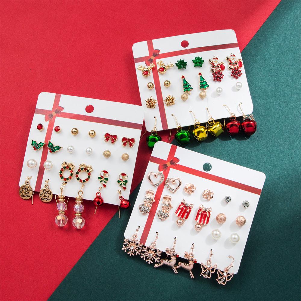 Рождественский комплект сережек: Серьги-пусеты с каплями масла в виде Санта-Клауса, колокольчика и елки - Подарочная коллекция из 12 штук