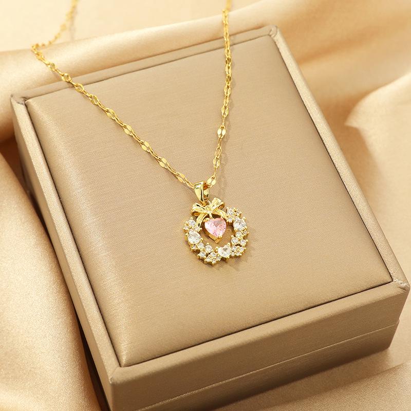 Women's Japanese and Korean Christmas Bow Wreath Necklace with Pink Diamond Heart on Titanium Steel Chain