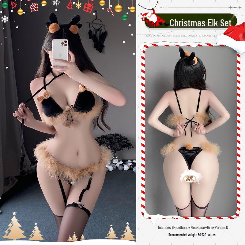 Man Yan Sexy Lingerie Bowknot Christmas Reindeer Plush Three-Piece Set