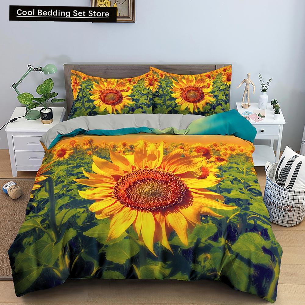 3D Пододеяльник с изображением подсолнуха King Queen, комплект постельного белья с желтыми цветами, цветочные зеленые листья, покрывало из 2/3 предметов из полиэстера, пододеяльник